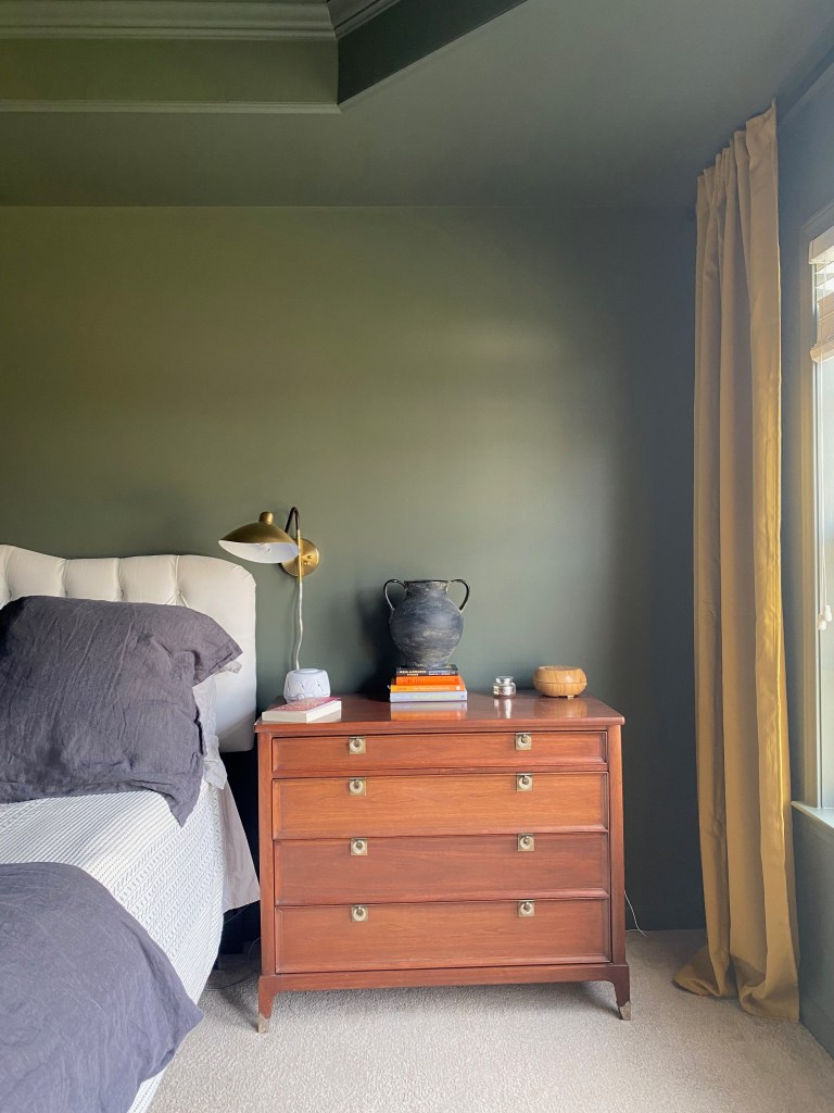 In all of our previous homes, our primary bedroom has been the last room to get attention. And frankly, in this home, it’s at the bottom of the list again because we have a huge kitchen renovation coming this year. But I also know that our entire first floor is going to be a disaster area for a few months and I wanted my husband and I to have a safe haven – somewhere we could go to escape the chaos. I’ve been slowly making changes in our room – first, by finding some chic mid-century modern three drawer dressers that we’re using as nightstands. We moved our old nightstands (themselves relics of the mid-century) down into our guest room. Our dressers, part of the same set as the nightstands, were moved into our boys’ rooms. I’ll eventually refresh those pieces but not anytime soon. I got some cool plug in sconces, which freed up surface area on the new dresser/nightstands – less clutter – and look so good with the new wall color.