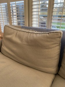 But honestly, we haven’t been pleased with how the couch has held up for us. It gets a lot of use – it’s our primary couch. But we don’t have young kids climbing all over it, the dog doesn’t get on it (unless he sneaks up there when he thinks we’re not looking), you get the idea. The back cushions got so saggy that last year I bought two boxes of polyfill, opened up those cushions and restuffed them! The seat cushions aren’t as supportive as they used to be and I haven’t quite figured out a way to fix them. I’m afraid if I use polyfill it will feel lumpy.