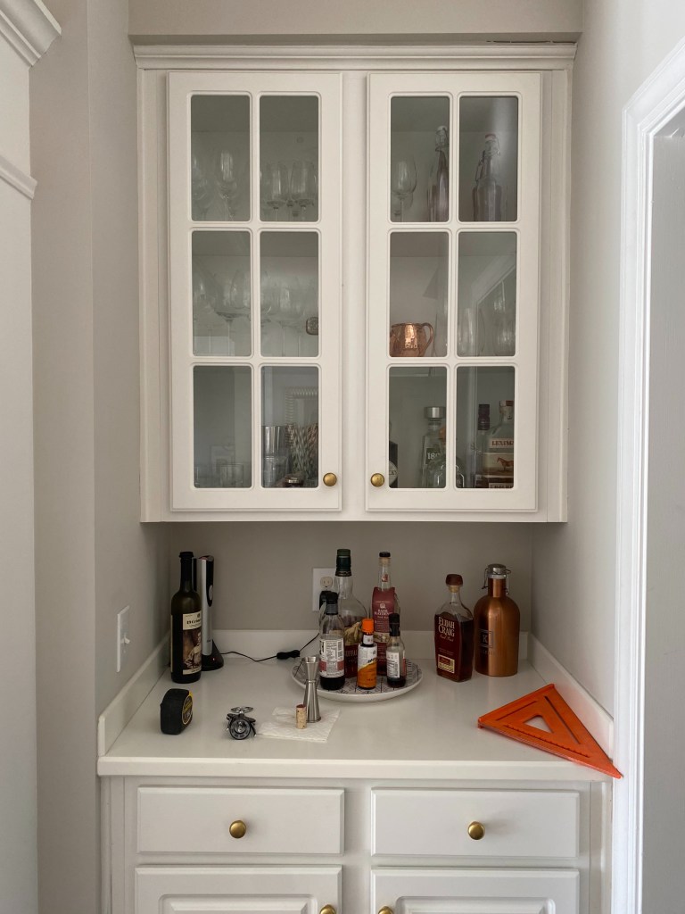 The dry bar is outfitted with the same amazing early 2000’s builder grade materials as the kitchen. The upper cabinet had a glass front, there was fluorescent under-cabinet lighting, and shiny yellow-gold knobs and pulls. We lived with it for about a year and then I asked my amazing husband (who isn’t afraid to try to make anything) to make some updates. Here’s a breakdown of what we did, including tools and cost.