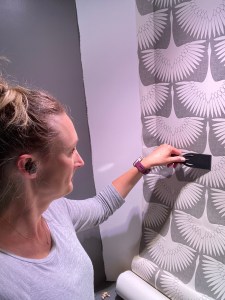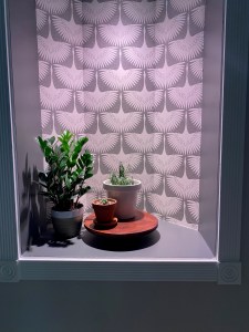 One day I had an epiphany and I knew it was a good one! I was going to turn one of the niches into a plant growing area inspired by Carmeon Hamilton (@carmeonhamilton) and Shavonda Gardner (@sgardnerstyle). They both have fancy grow lights for their plant babies. I bought a plant grow light that screws into the recessed light instead of a standard bulb. I got mine at Lowe’s but it’s actually cheaper on Amazon right now. I had seen (and fallen in love with) this gorgeous Genevieve Gorder wallpaper but it was too spendy so I found this significantly more affordable peel and stick version and thought I’d give it a try. I didn’t want to buy a ton of wallpaper so I decided to paint the sides and the bottom of the niche with a gray paint I already had on hand. I actually can’t even remember the name of the color – possibly Kendal Charcoal from Benjamin Moore? Anyway – I thrifted a few risers to provide some visual interest and bought some relatively inexpensive, yet hearty, plants to put in there. Against my better judgement, I really wanted to try a lavender plant there – spoiler alert – it didn’t survive.