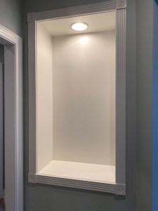 Our home has these weird niches that are all framed in, have fancy plinths, and recessed lights. They’d be great for displaying sculptures or something. But I don’t have those. I’m not that cool, hip, or artsy. I also hate buying stuff just to fill space, it needs to have a function for me. I’m not a minimalist, per se, but we’ve established that I’m lazy and extra objects in my home means extra things I have to dust and that is my LEAST favorite chore of all time. Note that this picture isn’t the actual niche I made over, this one is downstairs near our garage entry, but you get the idea.