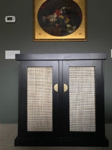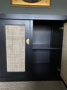 Because I’m so awesome at this blogging thing, I don’t have any before pictures (I mean, I’m sure we do somewhere but I’m not digging through 14 years of pictures) so allow me to describe it to you. The changing table was very solid – it had wooden side rails on three sides at the top, as is customary for a changing table. It had two shelves, both with sliders and some simple trim pieces on the side insets. For this upcycle, we knew we wanted to put doors on the cabinet so Husband did lots of research on inset doors and decided to give it a go. In order to have doors, we needed to remove the shelves and rail system. When I say we, I really mean Husband. He’s the one who really did all the work — I just supervised. Anyway, In order to provide some structural stability and allow for attachment points for new fixed shelves inside, he had to add a vertical piece of wood on the back and a piece in the middle of the front so we’d have two doors. I can’t give you a tutorial on the door build or the how-to of the modifications-because it’s not my thang but I can tell you, particularly with the doors, it involved a lot of playing around to get the hinges just right.