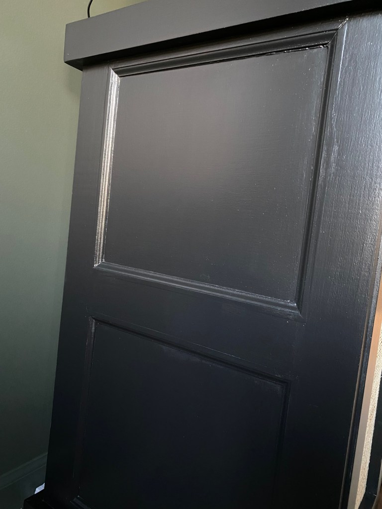 I decided to paint it SW Tricorn Black (surprise!) and we wanted to try out the new paint sprayer we bought for another project that still hasn’t happened yet — that turned out to be QUITE the adventure. The sprayer worked great once we figured out the right pressure but it uses a TON of paint. You cannot use this sprayer for small jobs, you need AT LEAST a gallon of paint. This is also where we learned that my face is allergic to something in paint. I woke up the next morning with a wicked rash that I ended up needing to go onto steroids for! Anywho, the sprayer made quick work of the painting job so the rest was the tedious process of applying finish. For years we’ve used Minwax Polycrylic – it doesn’t yellow over time and comes in several finish options such as Gloss, Matte, etc. It does tend to get little air bubbles when applying but that can be mitigated in a few ways – use a synthetic fiber brush, keep the brush wet with product, use long strokes, and sand between coats with a very fine sandpaper. For this project we actually used a find steel wool and it worked GREAT, even better than sandpaper IMO.