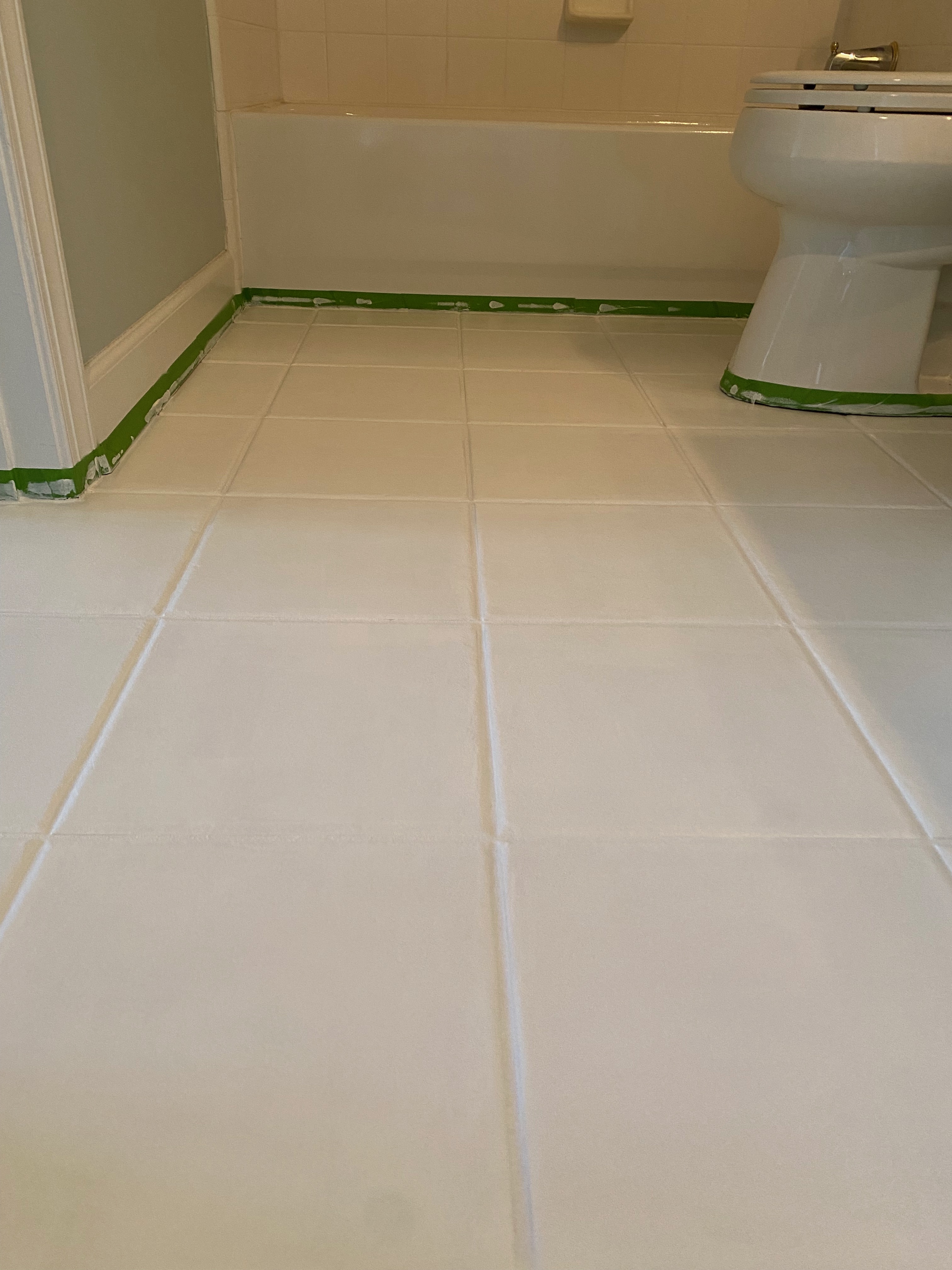 We’ve already established I’m lazy so rather than mop the floor and THEN sand and then mop again, I just went straight for sanding. You need to rough up the tiles a little so they’ll accept paint. I used 80 grit sandpaper on the orbital sander. Then I vacuumed the floor really well using a brush attachment. I used stripper at a 5:1 dilution. I made sure to wear chemical resistant gloves and eye protection. After scrubbing and wiping, the floor had to sit for 48 hours because you need the tile to be good and dry. Meanwhile, I went ahead and taped the bathroom so I’d be ready for primer. This was my first time using Frog Tape and I have to say, I was very impressed! It stuck even to the carpet transition between the bathroom and bedroom! Once I was ready to prime, I used a brush to cut in and to cover the grout lines, then rolled the rest. More waiting for the primer to dry – 24 hours (ish).