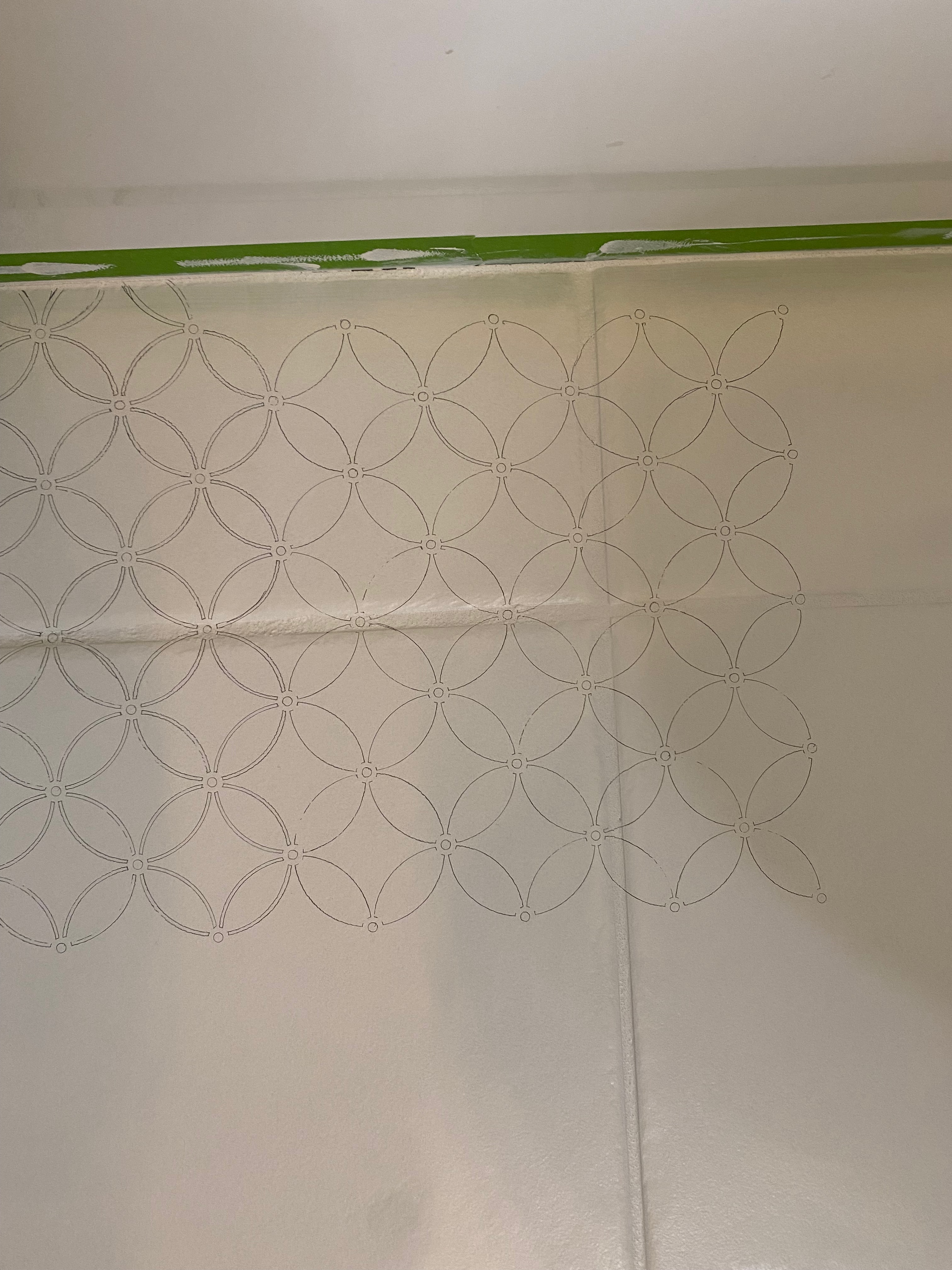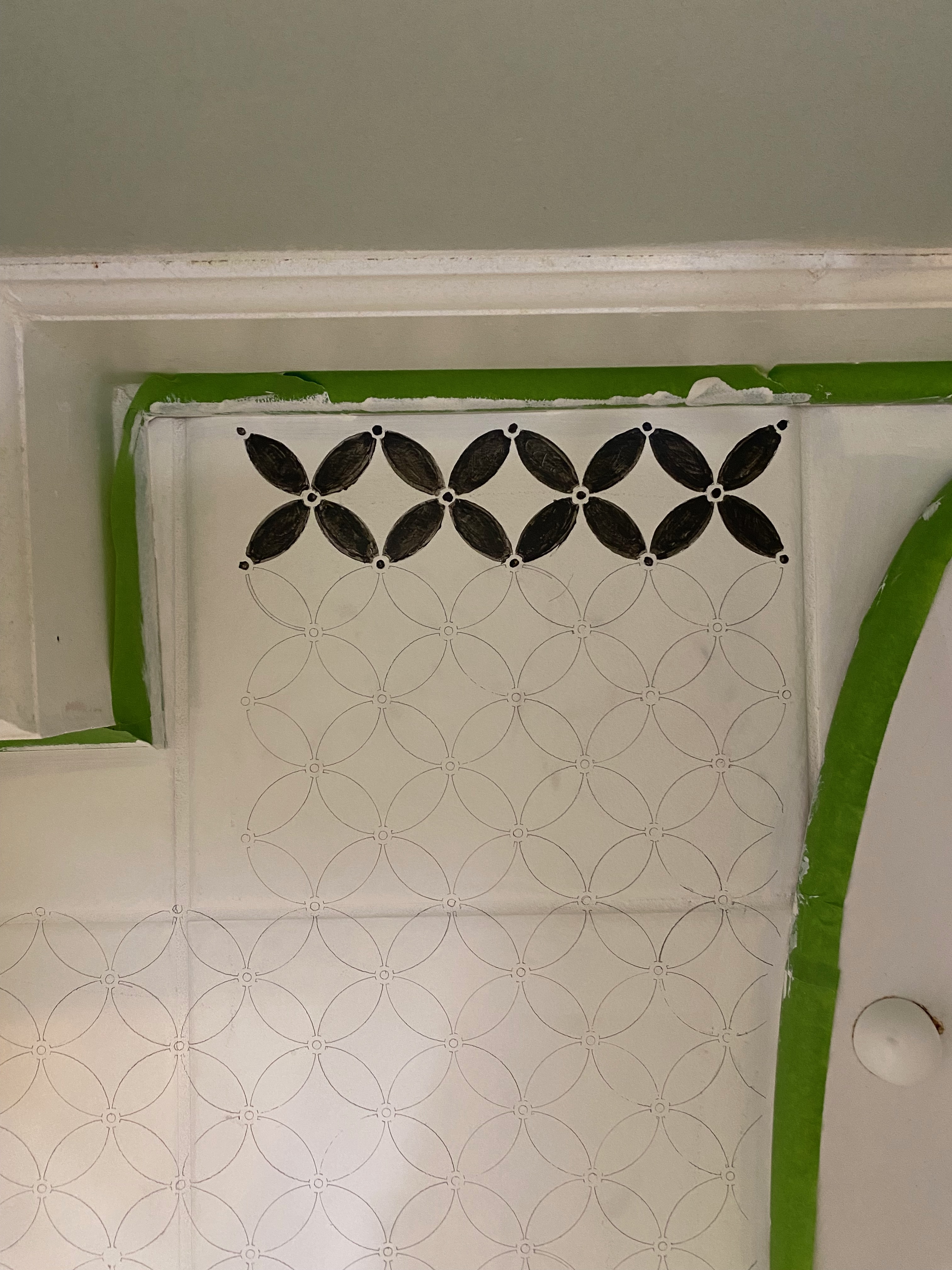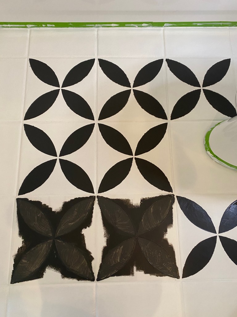 After two coats of the base color, White Flour, it wasn’t looking so great and I started having lots of doubts. However, a third coat took care of that so it was on to the stencil. I decided to go get a paint mixer attachment for the drill since the base color had not mixed well. That was a good choice – even with the drill attachment, it took about 5+ minutes to really get the paint mixed well. I knew the stencil was going to be a long process but I was willing to do it. Until I started tracing – I spent most of a day tracing that damn pattern onto half the bathroom floor. This was going to take forever! And then I spent almost an hour painting four little ‘flowers’ (see photo) and I decided this was NOT going to work. Pivot. Ok, maybe I can make my own stencil by making the pattern slightly larger and cutting out the parts I wanted painted black so I wouldn’t have to hand paint them all. We went to Michael’s as part of our date night and gathered a bunch of supplies and the following morning, I spent several hours coming up with a pattern mockup on card stock. (see photo) The mockup looked great but I was struggling with how to make the patterns match up on each tile – I was trying to avoid having to paint the grout. Then an angel from the heavens (Shalonne from @thebackuphouse) sent me a link to a larger stencil and I immediately ordered it. My friend Lauren from @goodtroublehome suggested Easy Tack to help the stencil stick on the floor and minimize paint bleeding. Note: you CAN get it on Amazon (bonus you don’t have to leave the house), but it’s actually quite a bit cheaper if you go get it at Michael’s 🙂