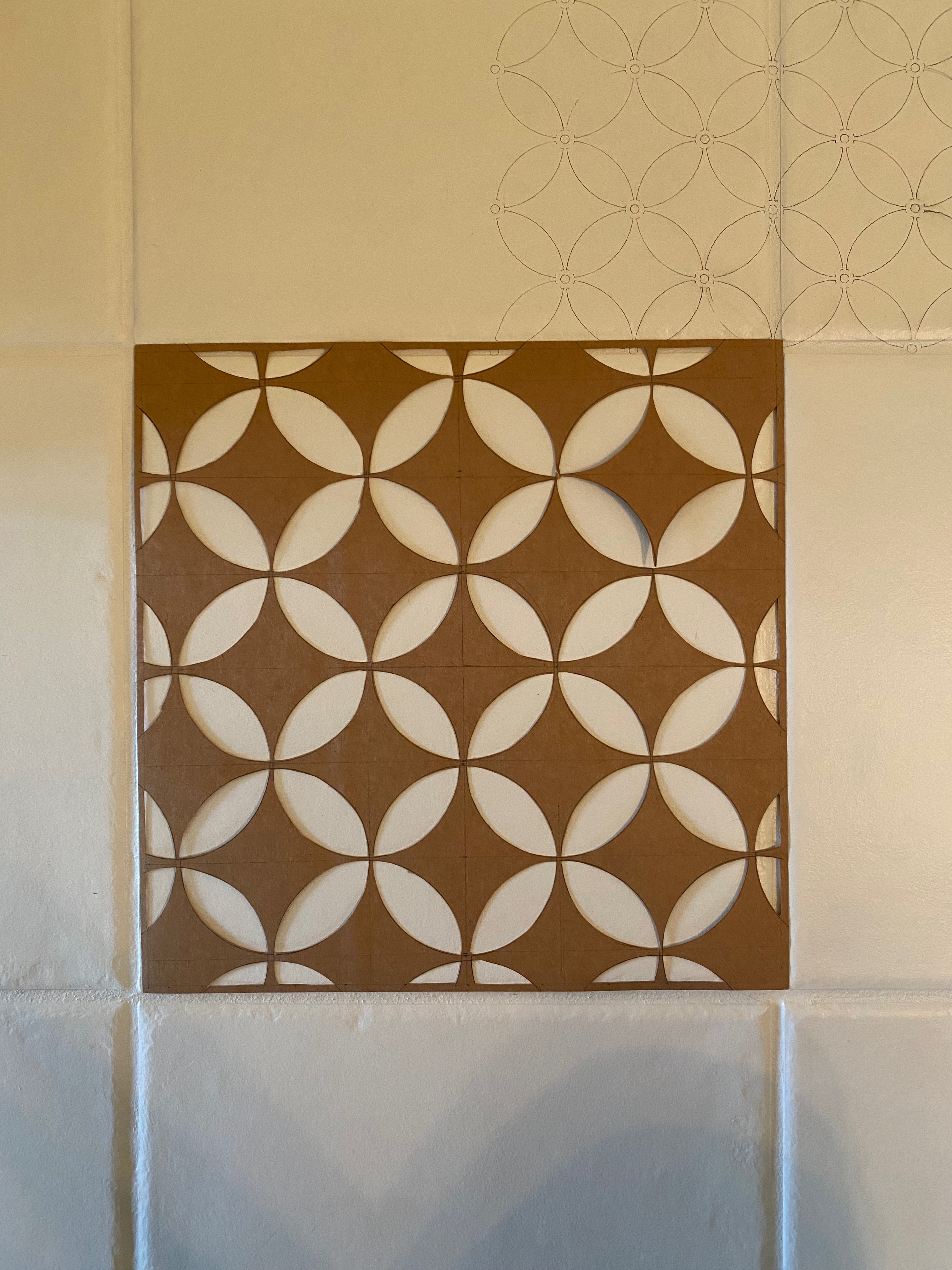 When the new stencil arrived, it was a bit bigger than I originally thought but I just wanted to get it done, so decided to go ahead with it. Plus, it came with two stencils so I could be a bit more productive! But first I had to clean off the pencil – I wanted to be efficient. Neither water nor a baby wipe worked. So I moved to rubbing alcohol and it worked like a dream, except in the grout lines, where I had to use an actual pencil eraser. But then I looked at my hands and I had paint residue on them – CRAP! I was starting to feel very defeated. I really didn’t want to recoat the floor. From afar, the floor still looked ok, so I decided to go ahead with the stencil process.