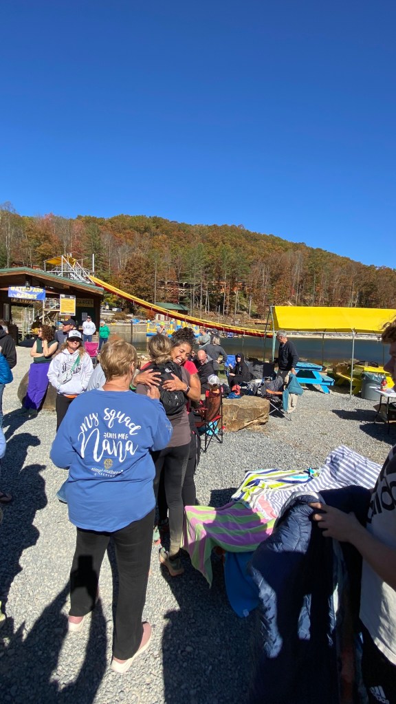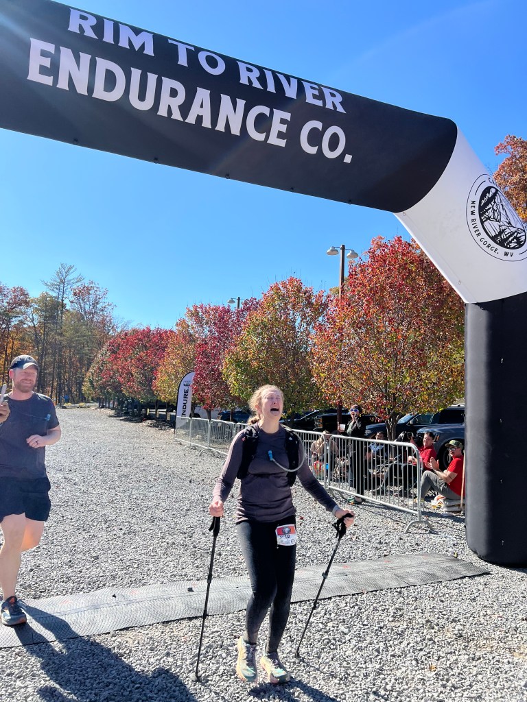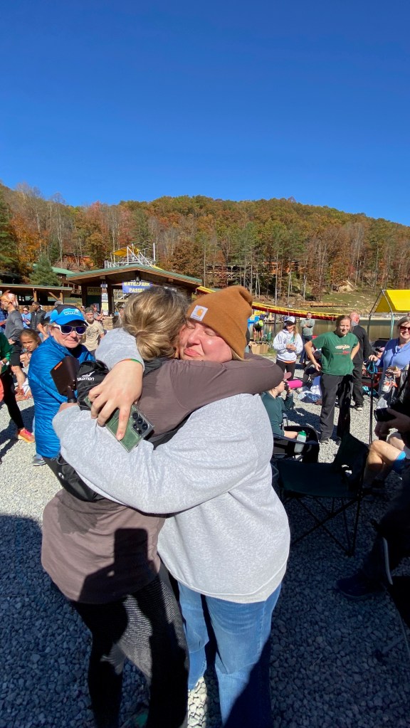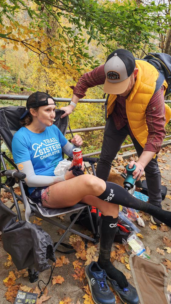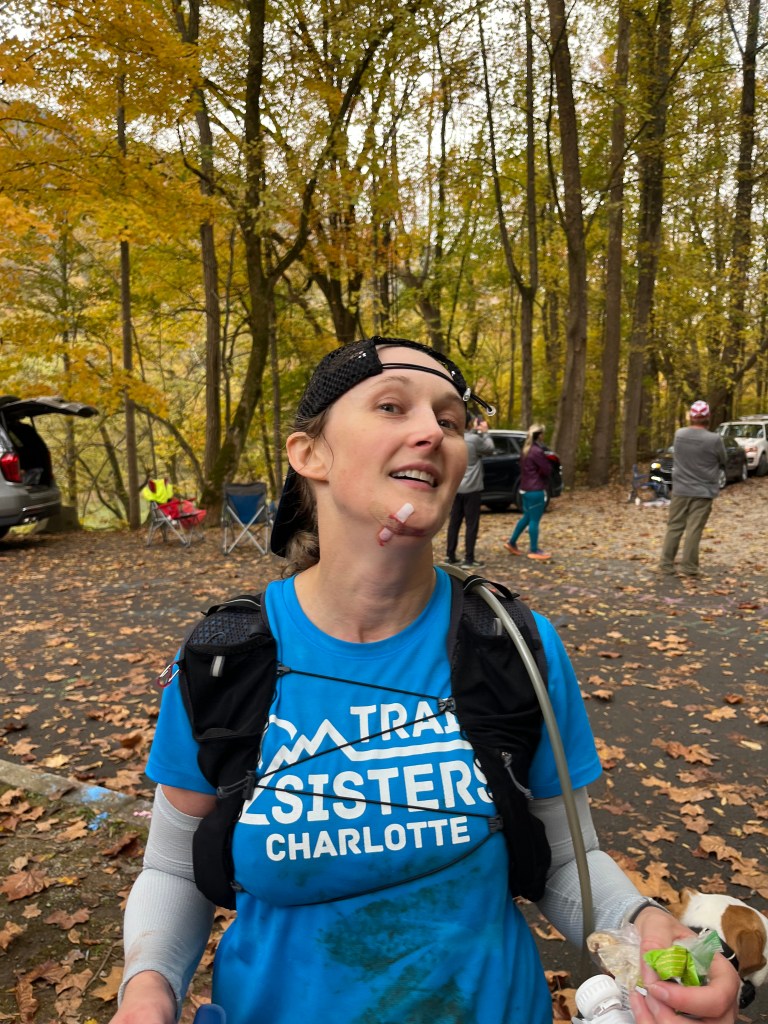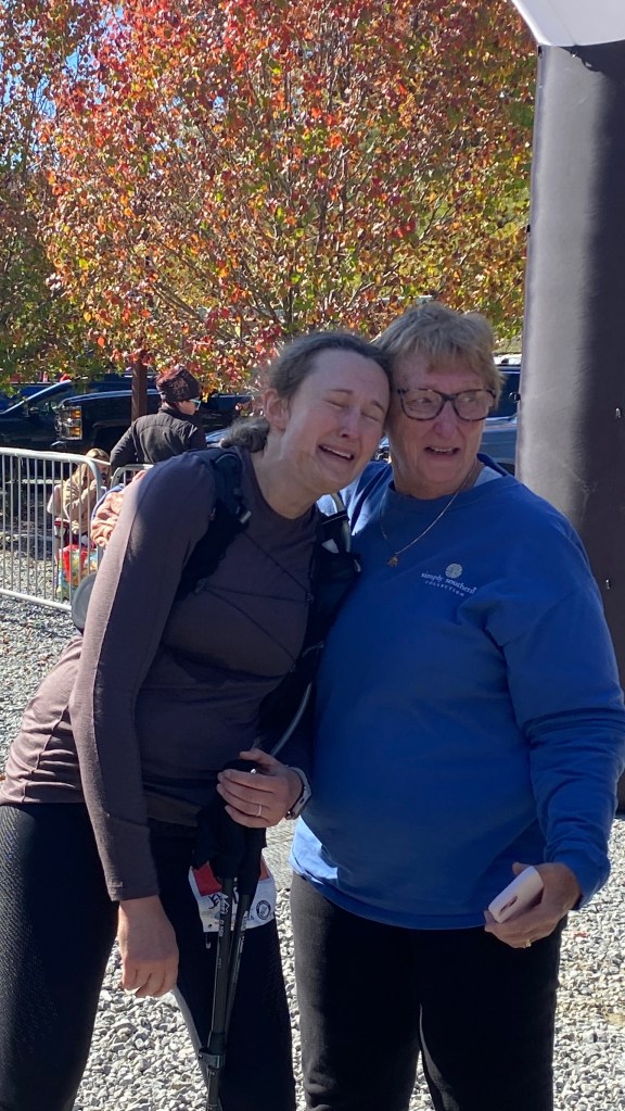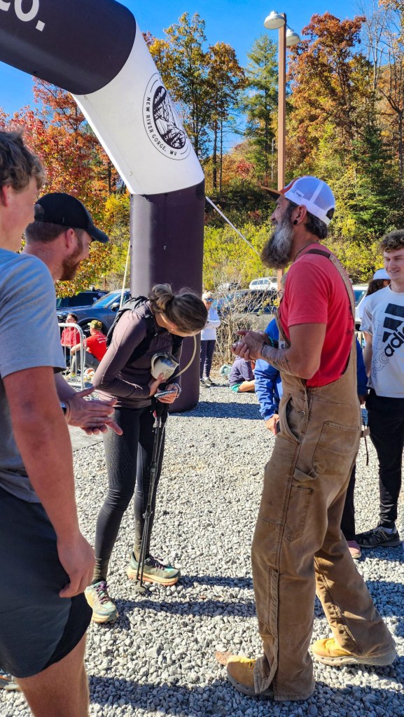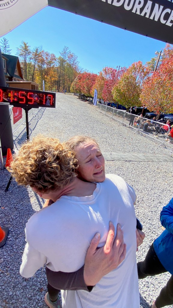 I hugged my husband, who quite literally got me through the last 7 miles. Who, a month before the race learned he needed to pace me the last 7 miles, who is not a runner but never hesitated to say “yes”, who works so hard M-F and then again on the weekends so I could go play in the woods for hours on end every single weekend for months. I hugged my mom, who has enthusiastically jumped into supporting me and the rest of the trail community at these ultra running events, who whispered into my ear at mile 85, who rubbed lube on my feet and toes when I literally couldn’t reach my own feet because of cramping. I hugged my kids, who have also given up family time while I played in the woods every weekend, who jumped in to be amazing helpers during the race, who cheered for me and gave me words of encouragement. I hugged Kim, who hates hugs, who kept me from panicking when I lost my pacers leading up to the race, who selflessly ignored her own needs during those miles she paced me to make sure I finished this, who listened to me literally moan and groan all night long in pain, who handed me the gloves off her own hands when I left mine behind during a potty stop, who let me sob but kept me moving. I hugged Christena, who drove all the way from Michigan, who was our unofficial crew photographer, who jumped in to do anything and everything that was needed at each and every point along the way, who yelled encouragement, who is one of the best internet friends I’ve ever been lucky enough to meet. I hugged my dad, who definitely doesn’t understand WTF is wrong with me but still shows up to support me, who tells his golf buddies how crazy I am but I know it’s his way of bragging. I hugged Bryant, the RD, who has created an amazing race and atmosphere, who is doing work in his community to bring his love of the outdoors to youth who otherwise wouldn’t be able to afford to do epic shit, who delights in seeing people in pain (just kidding, the pain is a side effect of achieving an incredibly difficult goal). I hugged Laura, Bryant’s wife, for being a friendly face at many aid stations, for also working so hard alongside Bryant to put on an incredible event and share their love of the WV wilderness with youth. I hugged “Angel Andrea”, who cleaned and patched my chin on several occasions, who was at several aid stations offering assistance and kindness. I hugged “Javelina Sarah”, who became my trail bestie (I don’t think she knows that though) when she appeared and helped calm my nerves after my epic fall at mile 13, who reminded me to take in more sodium because of my cramping, who told me about her favorite races, and who I hope I get to run with again someday.