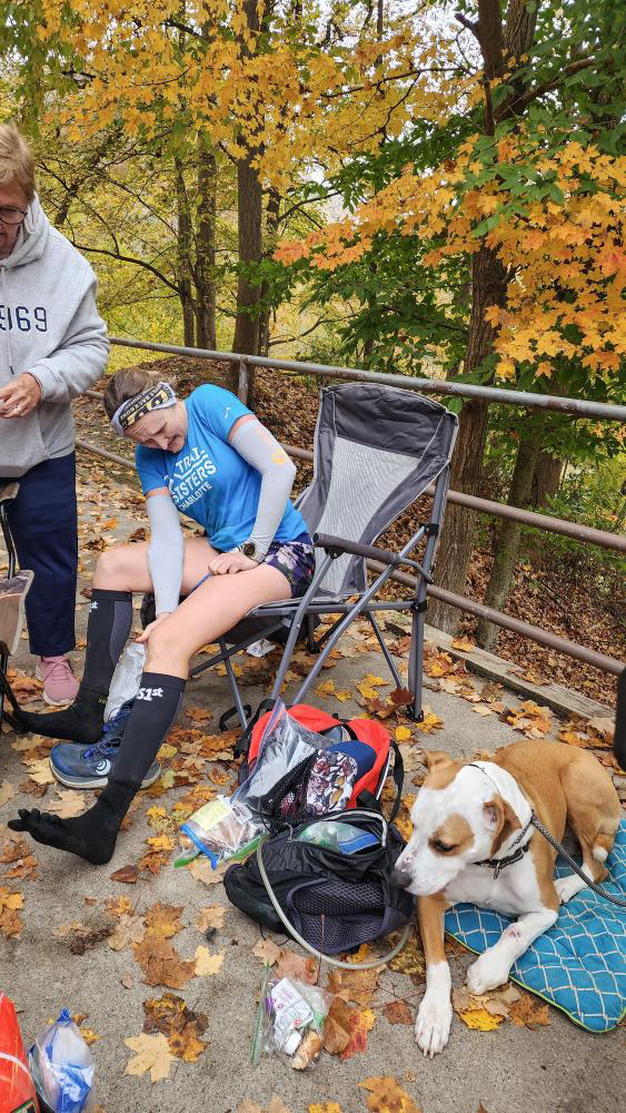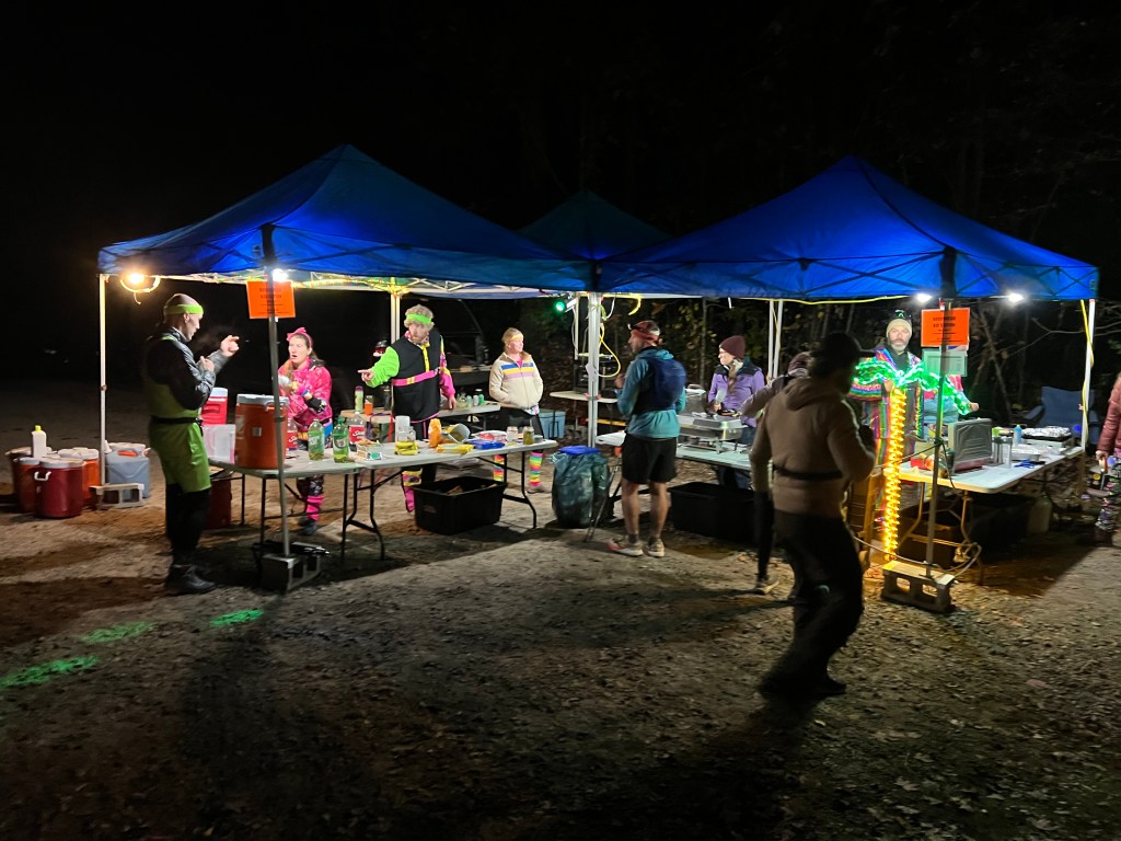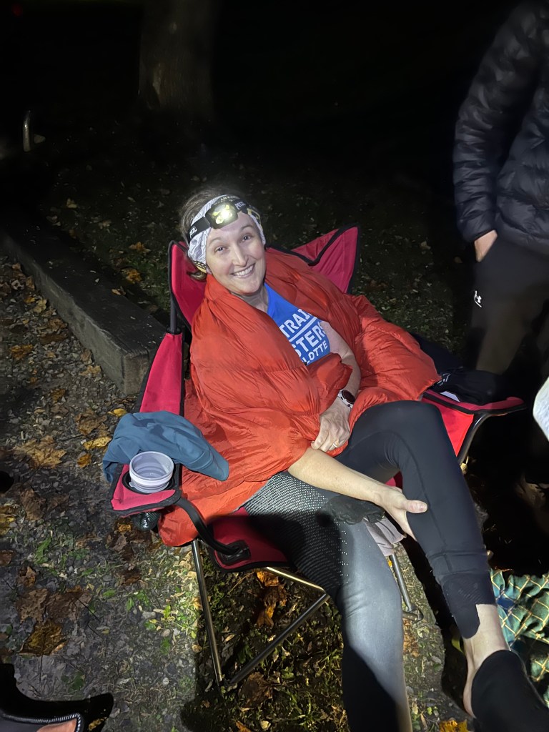 Coming into the Fayette aid station at mile 43 was awesome. There was a very energetic and kind woman directing traffic and many crew from other runners all cheering runners in. I got to see the whole crew again. I felt really good physically and mentally. I grabbed more pickle juice and broth and took a very short sit in a chair that didn’t belong to me. My pacer Kim knew them so it was fine 🙂 My crew filled up my water and then I had a short sit to use the percussion massager on my quads and hamstrings because I could feel my IT band trying to get grumpy. It was 9.5 miles to the next aid station and the turn around point. I grabbed my headlamp and waist lamp and headed back out.
