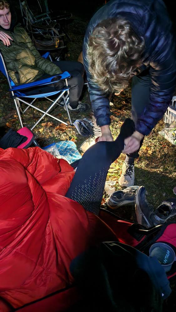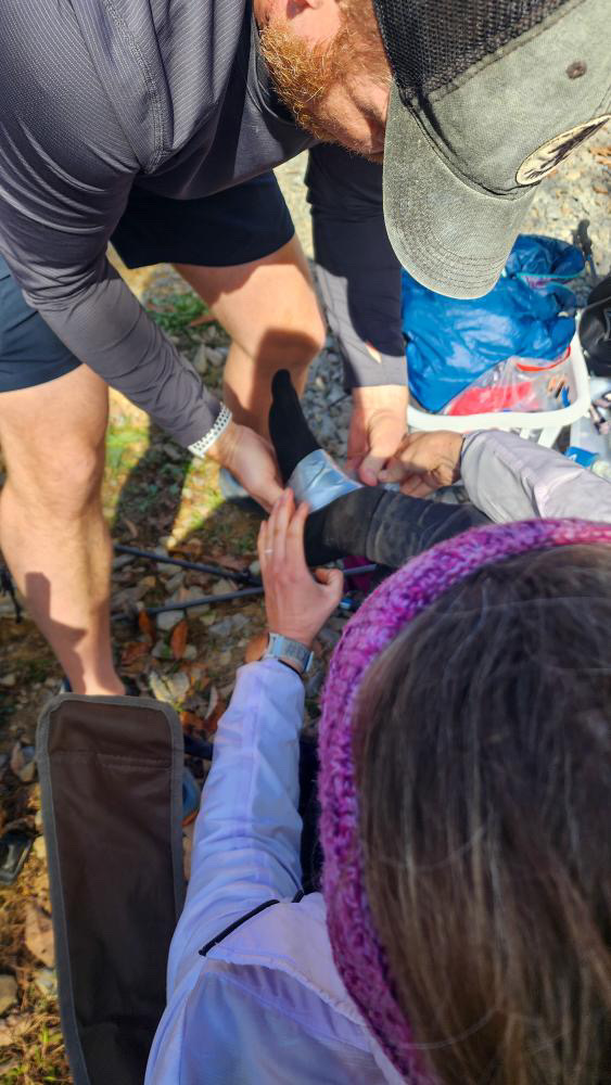 Coming into Cunard aid station at mile 80, I told Kim I needed to try to tape my ankle – the pressure was building and I was really starting to struggle to keep a good pace. My foot was no longer cooperating and navigating technical sections was becoming very painful and tricky. We put a few pieces of KT tape across the most painful areas. I figured it couldn’t hurt and it might help. I switched out my shoes one more time. The two prior pair had been Topo Ultraventure 3’s and this last pair was Hoka Mafate – a bit more cushion and an entirely different fit. I don’t remember a ton – I think I was getting pretty tired and we were losing a good bit of time. I had another fall overnight – I slid down the side of the trail trying to avoid the “steps” of rocks (bc I essentially had no control over my right foot and the pain was unbearable). The fall in itself wasn’t so terrible. It was frustrating, but I don’t remember getting hurt. But I almost couldn’t get myself back on my feet because of the steep angle and my fatigued legs and painful ankle.