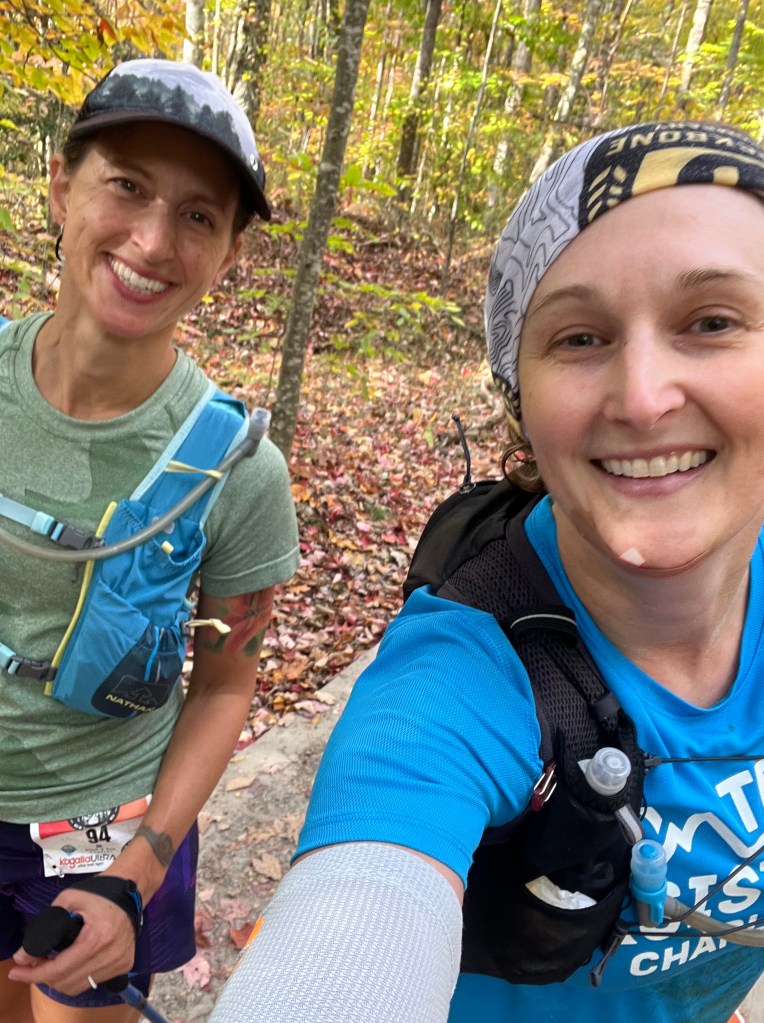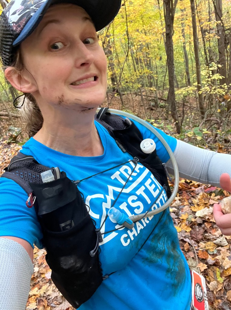 Heading down to Arbuckle Creek (mile 13 ish), I was excited that the water was pretty low and I wasn’t going to get my feet wet (most likely). The photographer set up there had music playing and “Jukebox Hero” was on. The chorus started right as I was crossing. I threw up my hand and rocked out across the rocks. Until my foot hit a slippery one and before I knew it I was face down and my chin smashed into a rock. Now, I don’t want to speak badly about the guys behind me but I didn’t hear a single one of them ask me if I was ok or needed anything. Maybe they did and I just didn’t hear it or remember it. I took a second to do a little self-inventory to make sure I was ok, and then picked myself up and pulled off to the side of the creek because I realized I’d cut my chin open. When I got going again, I found myself trying to throw a little pity party. I decided real quick that I wasn’t going to entertain that – yes I’d fallen, but it could have been SO much worse – I hadn’t busted my teeth or my legs or anything else I needed to be able to complete the race. It did take me about 20 min or so to get the jitters out of my system. It was also during this time I met “Javelina Sarah”. I have trouble remembering people’s names, so I will assign them some sort of nickname to help me remember. Sarah was just the energy I needed. She was kind, funny, and easy to talk to. Sarah’s pacer was originally supposed to run Javelina Jundred the same weekend but ended up not being able to so was pacing Sarah instead. Sarah and I spent a good bit of time together throughout the race and I truly enjoyed her company.